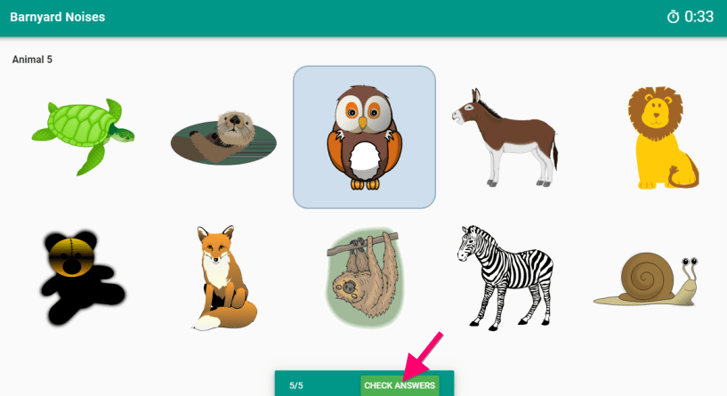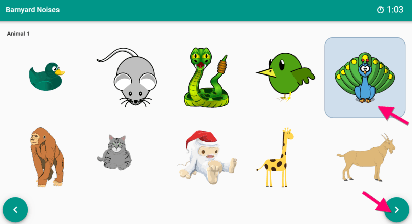 Guesser: Click on the animal that you think matches the sound from the Noise Maker. And then select the right arrow to move on to the next animal.
